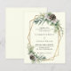 Pour un mariage d'hiver. Un arrière - plan en ivoire décoré de cônes, de baies blanches et de verdure. Un cadre géométrique en faux or. Personnalisez et ajoutez vos noms et détails. 1 feuille = 1 invite imprimé bord à bord.