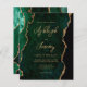 Cette élégante invitation de mariage présente une image de fond d'agate aquarelle verte émeraude taillée avec une fausse brillance dorée. Le texte personnalisable combine une écriture moderne dorée, des polices copperplate et italiques. Le verso présente un design assorti d'émeraude verte et d'agate dorée.