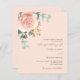 Un arrière - plan de couleur pêche. Décoré d'un rose doré floral, de feuilles d'eucalyptus vert aquarellés, de sprigs, de verdure et d'un faux doré. Personnalisez et ajoutez vos noms et les détails du mariage. 1 feuille = 1 invite imprimé bord à bord.