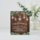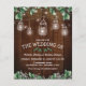 Faire-part de mariage rustique verdure abordable avec un fond de grange en bois sombre, feuillage d'arbre vert, lumières de jarres mason en guirlande, fleurs de bébé respirant et un modèle de mariage moderne éditable.