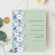 Un arrière - plan vert clair, décoré de fleurs bleues et blanches poussiéreuses. Personnalisez et ajoutez vos noms et détails. 1 feuille = 1 invite imprimé bord à bord.