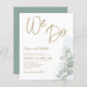 Ceci est un faire-part de mariage moderne et élégant 'Nous nous marions' calligraphié en or sur fond blanc avec l'ajout d'eucalyptus vert sauge et d'éléments botaniques coordonnés. Facile à personnaliser le texte pour créer quelque chose de vraiment unique.
