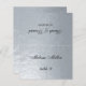 Une fausse carte de mariage argent avec le nom de l'invité et le numéro de table imprimé à l'avant et les noms de mariée et de mariée et la date du mariage imprimé sur l'autre côté (c'est-à-dire l'autre moitié, avant de la plier). Tout le texte est un script calligraphique noir. Taille : 4,5 po x 5,6 po avant pliage, soit 4,5 po x 2,8 po après pliage.
