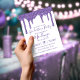 Invitation pour la fête de remise des diplômes avec des gouttes de paillettes violettes sur un fond blanc chic. Conçue par Cedar and String. Pour personnaliser davantage, veuillez cliquer sur le lien "personnaliser davantage" et utiliser l'outil de conception pour modifier le design. **Notre papier BUDGET est plus petit et plus délicat, mais toujours beau !** Si vous avez besoin d'aide ou d'articles assortis, veuillez nous contacter à cedarandstring@gmail.com.