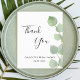 Une carte de remerciements pour une Fête des mariées. Un arrière - plan blanc chic décoré de verdure d'eucalyptus. Sur l'avant, grand noir de couleur manuscrit et le texte : Merci, votre et une date. Retour : Personnalisez et ajoutez Votre note de remerciement et votre nom.