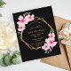 Une invitation à la fête d'anniversaire de 50ème (ou tout âge) avec fleurs d'hibiscus roses, verdure et cadre géométrique en faux or. Arrière - plan noir élégant. Modèles pour un nom écrit avec un script moderne de style manuscrit, modèles pour vos informations de fête. Texte doré. Retour : arrière - plan noir. > 1 feuille = 1 invitation imprimé d'un bord à l'autre.