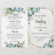 Fleurs bleues romantiques et programme de cérémonie des eucalyptus et mariages d'or, plié, Plan du jour de mariage verdoyant, programme de cérémonie des Mariages, Un design boho vraiment extraordinaire qui a captivé toutes les célébrations et événements au cours des dernières années, à savoir un bouquet somptueux - un mélange de couronnes d'eucalyptus vert, aquarelle élégamment mélangée de fleurs roses bleues et tissées en or cadre. Vous pouvez être sûr qu'avec ce design pour votre papeterie pour l'événement, vous serez top moderne et extrêmement impactable, et votre événement sera mémorisé pendant longtemps. Le design est présenté aquarelle peint à la main des feuilles d'eucalyptus vert frais mélangé dainty bleu rose fleurs, et délicat tissé autour - si moderne terrarium récent. Tout ce bouquet somptueux de fleurs roses et feuilles d'eucalyptus fraîches enveloppe élégamment les inscriptions du centre, comme si tendre étreinte d'amour. Dans ce magnifique design branché, nous avons préparé tous les éléments nécessaires à votre fête de boho - comme des invitations pour mariage, des invitations pour la douche nuptiale, fiançailles, elopement, anniversaire, jeux, affiches d'accueil, des panneaux de table et bien plus encore, pour obtenir un ensemble complet de ce boho design exceptionnel avec une aquarelle eucalyptus verdure mélangé de fleurs bleues poussiéreuses peonies.