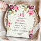 Papier à prix abordable personnalisable, invitations à 90e anniversaire avec de jolies fleurs rose aquarelle et magenta sur un arrière - plan vert sauge pastel.
