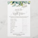 Ce feuillage "What's in your phone" est parfait pour un baby shower rustique. Le devant de la carte de jeu comporte "devinez le bon prix", et le dos de la carte contient "ce qui est dans votre téléphone". L'aménagement comprend un cadre boho composé de feuilles verts et de plantes botaniques verdoyantes. Personnalisez l'avant de la carte avec le nom de la mère à être et la date du baby shower. Vous pouvez personnaliser les questions du jeu en cliquant sur le bouton "personnaliser".
