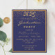 Une invitation moderne et élégante à une fête de remise des diplômes 2025. Pour lui et elle. Un arrière - plan bleu marine classique et une pluie de confettis dorés. Avec un cadre en faux or. Modèle pour le nom et les détails de la fête. Le texte Graduation et le nom sont écrits avec un script de style manuel moderne. Lettres d'or. Retour : bleu marine couleur arrière - plan, confetti
