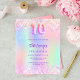 Une invitation à la fête du 10e anniversaire féminine et féminine. Devant : Un arc-en-ciel, arrière - plan de couleur holographique en violet, rose, vert menthe. Décoré de confettis rose vif. Personnalisez et ajoutez un nom et des détails du parti. Le nom est écrit avec un script de style écrit à la main, des lettres de couleur violette. 1 feuille = 1 invite imprimé bord à bord.