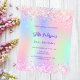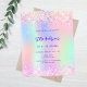 Une invitation à la fête du 21e anniversaire féminine et féminine. Devant : Un arc-en-ciel, arrière - plan de couleur holographique en violet, rose, vert menthe. Décoré de mousseux roses rousses. Personnalisez et ajoutez un nom et des détails du parti. Le nom est écrit avec un script de style écrit à la main, des lettres de couleur violette.