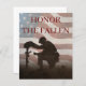 Honore les morts avec un dernier salut. En l'honneur de nos membres déchus des forces armées. Le soldat s'agenouille devant la tombe de son camarade déchu. Dans l'arrière - plan le drapeau des Etats-Unis.