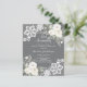 Pour un 25ème anniversaire de mariage élégant et romantique. Un arrière - plan gris décoré de fleurs blanches, de roses et de dentelle blanche. Personnalisez et ajoutez vos noms et détails. 1 feuille = 1 invite imprimé bord à bord.