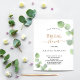 Un arrière - plan blanc décoré de sprigs de verdure d'eucalyptus. Personnalisez et le nom de la mariée à être et les détails du parti. Lettres noires et dorées. Retour : arrière - plan vert.