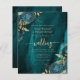Cette élégante invitation à un mariage présente des bouquets turquoises de fleurs bleues, agrémentés d'une végétation en faux feuille d'or en deux coins, sur une image arrière - plan d'agate d'aquarelle turquoise. Le texte personnalisable combine des polices serif, italique et écriture manuscrite de couleur or. L'envers offre de l'espace pour les détails du mariage, ainsi qu'un code QR que les clients peuvent scanner pour visiter votre site Web et RSVP, ce qui permet d'économiser le coût d'impression et d'envoi de cartes RSVP séparées.