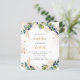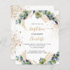 Un fond blanc décoré de verdure d'eucalyptus et de feuilles dorées et de gouttes de paillettes dorées fausses. Personnalisez avec le nom de l'enfant et les détails de la cérémonie. Lettres de couleur noire et dorée.