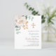 Une végétation fleurie blanche, eucalyptus et une croix dorée. Personnalisez et ajoutez un nom et des détails. 1 feuille = 1 invite imprimé bord à bord.