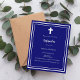 Un arrière - plan bleu marine, décoré d'un cadre blanc, et d'une croix blanche Personnalisez et ajoutez le nom et les détails. Texte blanc. 1 feuille = 1 invite imprimé bord à bord.
