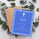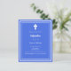 Un arrière - plan bleu royal, décoré d'un cadre blanc, et d'une croix blanche Personnalisez et ajoutez le nom et les détails. Texte blanc. 1 feuille = 1 invite imprimé bord à bord.