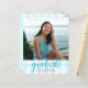 Soyez fier, réjouissez-vous et annoncez au monde que votre groupe favori a atteint son jalon avec cet invitation budget personnalisé, simple, moderne et étonnant. Scénario de calligraphie de parties scintillant bleu, gris sans serif et une photo de votre choix superposent un arrière - plan rayé bleu turquoise clair et blanc. Personnalisez le texte personnalisé avec le nom de votre diplômé, le nom de l’école, l’année de cours et la date de fin d’études. Au verso, ajoutez votre note personnelle, la prochaine école où ils vont, les renseignements sur la fête, etc. Garanti d'ajouter du plaisir élégant à leur occasion spéciale! Il suffit de remplacer l’échantillon de photo par un de vos propres, de taper les informations de votre grade, de customiser le message au dos, et de personnaliser facilement cette invitation de faire-part de graduation budgétaire. S'il vous plaît, envoyez-moi un message avec toute question ou demande.