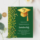 Une invitation moderne et élégante à Graduation Party. Un arrière - plan vert émeraude décoré de faux confettis d'or et d'une grande casquette de graduation dorée avec goût. Personnalisez et ajoutez un nom et des détails du parti. Texte blanc. 1 feuille = 1 invite imprimé bord à bord.