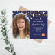 Ajoutez votre propre photo verticale du diplômé. Un cadre d'arc photo. Une couleur arrière - plan marine chic, décorée de faux étoiles dorées. Personnalisez et ajoutez un nom et des détails du parti. Lettres d'or.