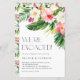 Invités Invitations à votre événement avec cette invitation personnalisée de papeterie de fête de fiançailles. Il présente des illustrations d'aquarelle de feuilles de palmiers, de feuilles de bananes, d'hibiscus, de plumeria et d'autres plantes tropicaux. Personnalisez l'invitation de la partie d'engagement tropical en ajoutant des noms, l'heure, la date et d'autres détails de l'événement. Cette invitation à la fête de fiançailles florales est parfaite pour les fêtes de fiançailles estivales.