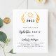 Fond blanc. Une fausse couronne de laurier d'or classique et une casquette de graduation. Personnalisez et ajoutez l'année, le nom et les détails. Texte noir. 1 feuille = 1 invite imprimé bord à bord.