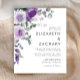 Cette invitation de mariage moderne présente un arrangement aquarelle de fleurs violettes et lilas et de verdure d'eucalyptus s'incurvant dans le coin supérieur gauche. Modifiez le texte gris charbon sans empattement avec les noms des mariés et les détails du mariage sur fond blanc. Le verso est blanc uni. REMARQUE : les enveloppes ne sont pas automatiquement incluses avec ces invitations économiques, alors n'oubliez pas de choisir l'option "enveloppes blanches" !