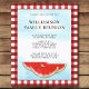 Prévoyez-vous une réunion de famille ? Cette invitation budgétaire est décorée avec des pastèques aquarelles et un ciel bleu sur un arrière - plan de buffle rouge et blanc. Facile à personnaliser. Aquarelle originale © Michele Davies.