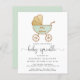 Cette mignonne invitation à l'arrosage de bébé, qui est respectueuse du budget et du genre, présente une aquarelle verte et dorée à la menthe pastel d'un chariot rétro pour bébé. Vous pouvez personnaliser le texte sur le chariot (par exemple, "It's a Girl!") ou laisser vide. "baby shower" est écrit dans un script élégant avec des swashes.