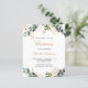Un arrière - plan blanc décoré de verdure d'eucalyptus et de feuilles dorés. Personnalisez et le nom de l'enfant et les détails de la cérémonie. Lettres noires et dorées. Retour : arrière - plan vert