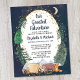Invitation baby shower du couple rustique budget avec une jolie aquarelle illustrant les animaux des bois avec leur tente campant dans les montagnes et la forêt, une superposition d'étoiles d'or et la lune dans un ciel nocturne et "Notre plus grande aventure" et les noms des parents à être dans un sombre scénario bleu minuit.