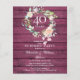 Avec une délicate guirlande florale aquarelle sur un fond de panneaux de bois rustique rouge, cette invitation chic et botanique pour une fête surprise de 40e anniversaire de mariage peut être personnalisée avec vos informations spéciales d'anniversaire de rubis. Le verso présente une guirlande florale assortie encadrant les dates d'anniversaire en texte blanc élégant sur un fond de bois rouge. Conçue par Thisisnotme©