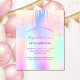 Une invitation à la fête d'anniversaire de 18e anniversaire, féminine et féminine (ou tout âge). Devant : Un arrière - plan de couleur holographique en violet, rose, vert menthe, or rose. Décoré avec des gouttes de parties scintillant en violet, rose et faux or. Personnalisez et ajoutez un nom et des détails du parti. Le nom est écrit avec un script de style écrit à la main, des lettres de couleur violette. Dos : couleurs arc-en-ciel et gouttes de parties scintillant faux.