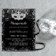 Pour une Masquerade élégante, 50e (ou tout âge) anniversaire. Un arrière - plan noir. Décoré de parties scintillant en faux argent et d'un masque masqué. Personnalisez et ajoutez un nom, un âge et des détails de la fête. Le nom est écrit avec un script de style manuscrit