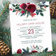 Modèle d'invitation élégant pour une soirée d'entreprise à l'occasion des fêtes de fin d'année en aquarelle, avec des bouquets de roses peonies rouges, burgundy et blanches, accompagnés de branches de sapin vertes et de feuillage, ainsi que de baies rouges.