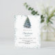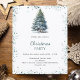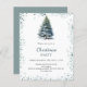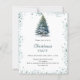 Invitations hivernales pour une fête de Noël. Un arrière - plan blanc à l'avant décoré d'un pin dessiné à la main couleur de l'eau avec de la neige et une parties scintillant étincelante imitation verte. Personnalisez et ajoutez les détails de votre fête. Retour : arrière - plan bleu-vert. 1 feuille = 1 invite imprimé bord à bord.