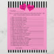 Ce jeu de mariée ou de wedding shower amusant fait un grand ajout à un nuptial ou un wedding shower. Le design présente des rayures noires et blanches comme toile de fond avec deux coeurs roses au sommet. Un coeur dit "Qui sait" et l'autre dit le nom de la mariée (que vous pouvez customiser) sur le dessin. Il y a une place pour le nom de l'invité de la fête, les instructions de jeu et 20 questions sur la mariée. L'idée est de voir qui connaît le plus la mariée avec la personne qui obtient le plus de points gagnant le jeu. Ce qui est génial dans ce jeu de douche nuptiale c'est que vous pouvez le customiser avec le nom de la mariée et vous pouvez le customiser avec la couleur de la mariée comme l'arrière - plan pour les questions...pour ce faire, cliquez sur modifier et choisissez une couleur arrière - plan. Ce jeu de douche nuptiale est présenté sur papier de lin pour faire un beau look pour une douche nuptiale, mais vient aussi dans d'autres papiers. Un jeu amusant et unique en plus de votre douche nuptiale. Copyright henishouseo