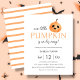 Invitation papier simple et moderne pour un baby shower Halloween avec une jolie citrouille sur un fond blanc propre. Avec les mots " notre petite citrouille est en route " et une alternance de pastel orange et blanc. Prêt pour une personnalisation facile.