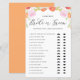 Devine qui ! Mariée ou mariée ? Ajoutez ce jeu de douche amusant et facile à votre événement. Il présente des illustrations d'aquarelle de pêches, de fleurs pastel et de verdure. Personnalisez en ajoutant un arrière-plan. Cette carte de jeu He Said, She Said, est parfaite pour les mariages et les douches nuptiales.