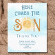 Le carte de remerciements de baby shower de ce garçon à budget présente le texte "Voici le Fils" en typographie rétro bleue avec une aquarelle jaune soleil, ciel bleu, et nuages. Facile à personnaliser. Parce que nous créons notre oeuvre, vous ne trouverez pas cette image exacte d'autres designers. Aquarelle originale © Michele Davies.