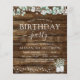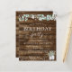 Cartes d'Invitation d'Anniversaire de Style Rustique Campagnard en plein air sur Bois Sombre avec Feuillage, Eucalyptus et Coton avec des Pots sur une Guirlande Lumineuse pour le Printemps, l'Été, l'Automne ou l'Hiver - comprend une belle et élégante typographie script pour la célébration spéciale de la fête d'anniversaire.