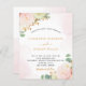 Un arrière - plan blanc avec des traits d'aquarelle rose pâle et or rose. arrière - plan. Décoré de fleurs aquarellées, de fleurs roses florales, d'orchidées blanches et d'une gerbera jaune, de végétation d'eucalyptus et de sprigs en faux or. Personnalisez et ajoutez vos noms et les détails du mariage. Lettres noires et dorées.