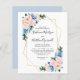 Ces invitations de mariage présentent un motif floral aquarelle avec des fleurs roses bleues et rousses, un feuillage d'eucalyptus et un cadre géométrique en faux or. Personnalisez le libellé de l'invitation avec votre propre texte. Ces invitations de mariage font partie d'une collection qui comprend une gamme de papeterie mariage et d'autres articles mariages correspondants. Visitez notre magasin pour voir la gamme complète.
