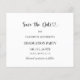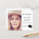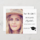 A photo Save the date card for a graduation party. On front: Add your own vertical size photo of the graduate. A chic white background, black text. Templates for a name and date. The name and the text: Save the Date are written with a modern hand lettered style script. With a cap, tassel topper. Back: party details. 1 sheet = 1 Save the Date printed edge to edge.