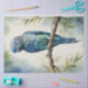 Cette délicate aquarelle présente une charmante perruque bleue perchée sur une branche d'eucalyptus, entourée de feuilles verts doux. Les coups de pinceau doux et la palette de couleurs apaisantes créent une scène paisible et d'inspiration nature, parfaite pour les amateurs d'oiseaux et d'art botanique.