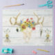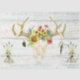 "BOHO Sunflower Deer Skull with Antlers, Floral Arrows Rustic White Wood Decoupage, papier de tissu lourd pour l'artisanat et la décoration de meubles." Des tournesols rustiques peints à la main et des fleurs sauvages au feuillage feuillu décorent un crâne de cerf avec des bois et sont placés sur un arrière - plan blanc doux en bois de chalet qui a été affligé. Un amas de flèches avec plumes et fleurs sont à chaque coin. Une superposition écriture éphémère de script finit la conception. Peint en aquarelle, pastels à l'huile puis dessiné graphiquement par Audrey Jeanne Roberts, artiste et designer de renommée internationale, copyright.