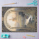 Vintage défilement Art Nouveau Victorien, arqué design doré est jumelé avec un Château d'imaginaire sur une colline avec une lueur légèrement éthérée. En contrebas, un lac et un jardin fleuri paisible complètent la scène. Soigneusement rehaussée par l'éphémère écriture manuscrite qui est superposé sur l'image texturée craquelée. MSP0119